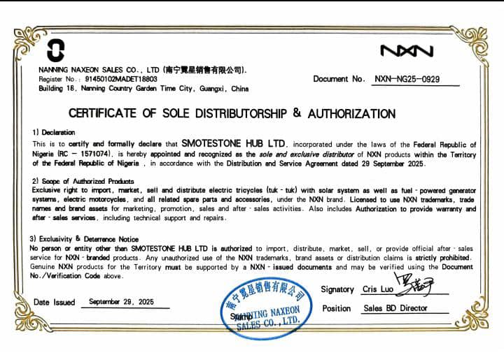 Smotestone Hub Ltd began with a vision to transform Nigeria’s transportation landscape. As the sole distributor of NXN Solar-Powered Tricycles, we’re committed to providing eco-friendly, cost-effective mobility solutions. Our journey combines innovation with sustainability, bringing solar technology to everyday transportation while creating opportunities for both riders and investors.